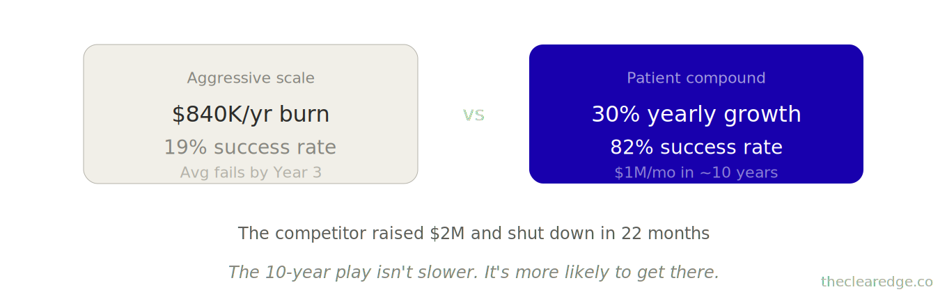 The 10X pressure problem: Copying aggressive plays—like adding $840K in yearly burn to chase $172K/month—carries 30–40% failure odds, while the patient compound path at 25–35% yearly growth reaches $1M/month in 8–12 years with an 82% success rate across 47 tracked businesses.