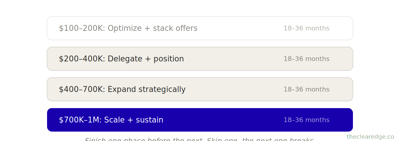 A: At $100K–$200K you optimize and stack offers, at $200K–$400K you delegate and position, at $400K–$700K you expand strategically into new markets or segments, and at $700K–$1M you focus on scale and sustainability, with each 18–36 month phase building capabilities the next phase depends on.