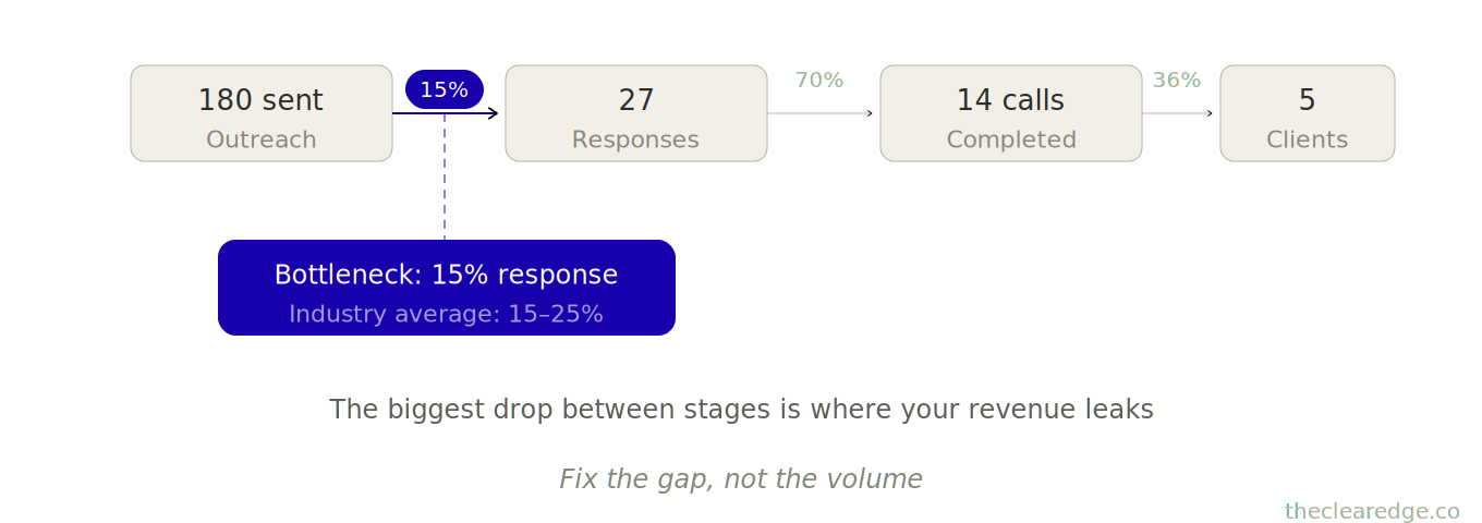 Before signing the contract, we mapped his funnel and saw his real bottleneck was a 14% outreach response rate — even if he doubled the close rate, he’d only add two clients monthly because he wasn’t getting enough conversations.
