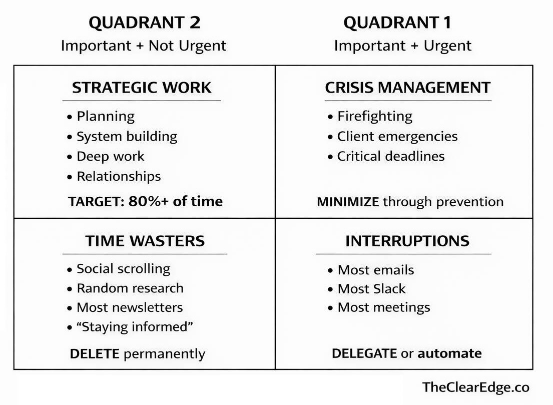 Quadrant 2 (Not Urgent + Important): Strategy, system building, relationship development, deep work. This is where 80%+ of your time should live. This quadrant compounds.