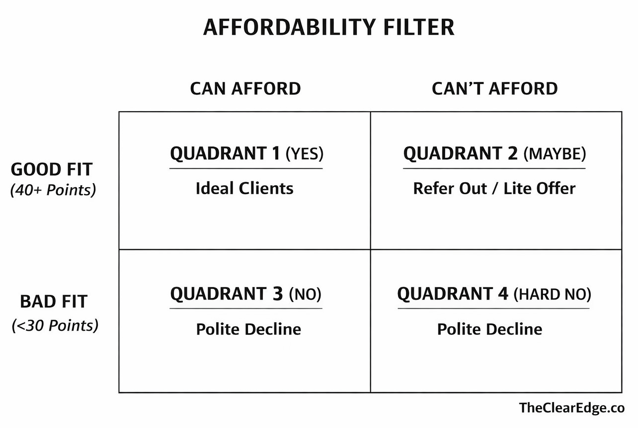 Apply the matrix to the current client roster. You’ll likely find 2-3 bad-fit clients (Quadrant 3) you accepted before having a framework.