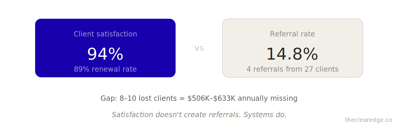 The delivery problem: Treating referrals as post-project favors leaves 14–18 missed referrals and $42,184–$52,730 in monthly recurring revenue on the table despite happy clients.