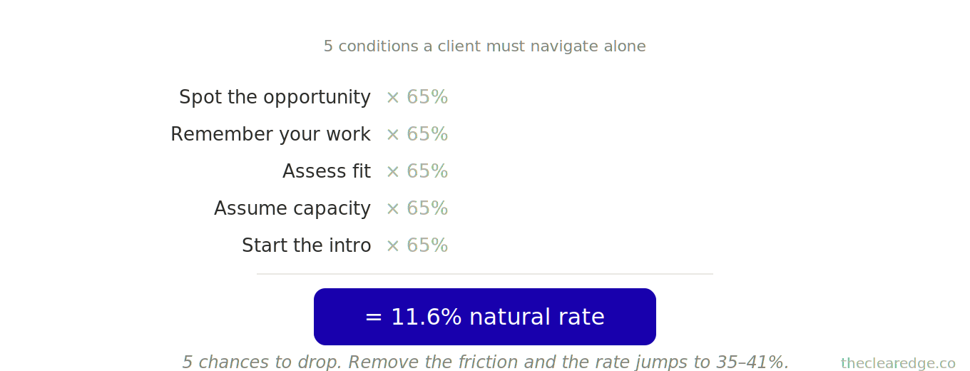 A: Because clients must navigate five unguided steps—recognizing a problem, recalling your work, assessing fit, assuming your capacity, and initiating an intro—each with roughly 60–70% pass-through, which mathematically collapses into an 11.6% natural referral rate without systems.
