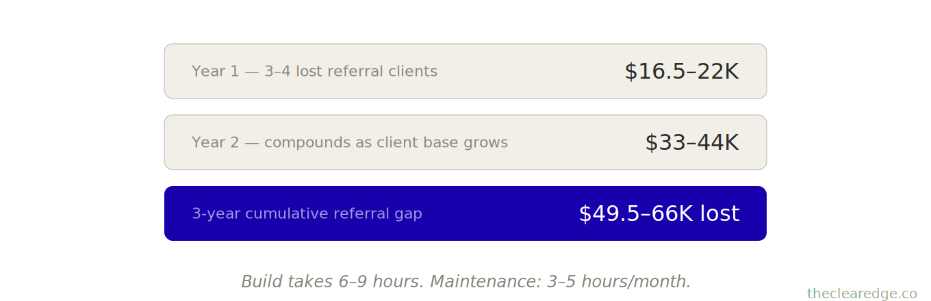 Over 3 years: $49,500–$66,000 in cumulative lost revenue from referrals that should have happened