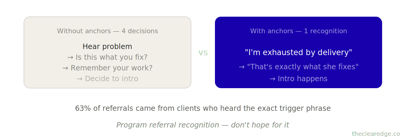 A: Use them at three points in delivery—like Weeks 4, 9, and 14—by tying common phrases (“I’m working too hard for what I’m making,” “I can’t raise my prices,” “I’m exhausted by delivery”) directly to your solution so clients instantly recognize referral opportunities months later.