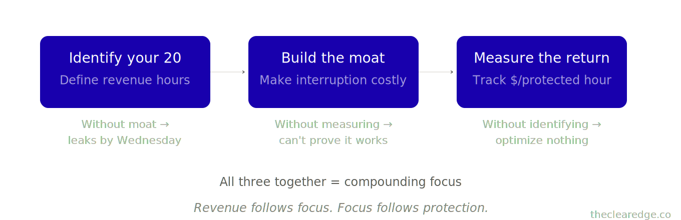 What you’ll learn: A punchy Focus That Pays system with three moves—identify your 20 revenue hours, build a moat around them, and measure revenue per protected hour.