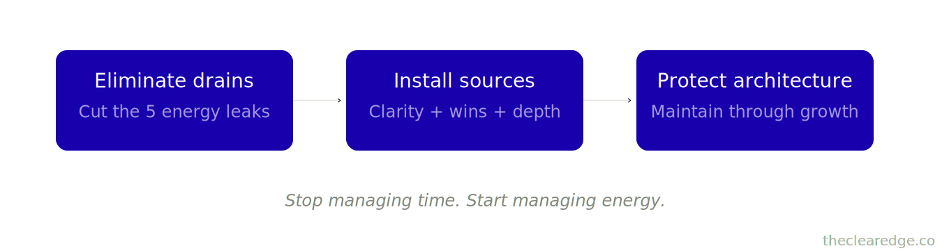 The Clear Edge OS Founder Fuel System is a practical three-phase operating rhythm that surfaces five energy drains, installs three fuel sources, and keeps you executing at full capacity at $70K–$100K.