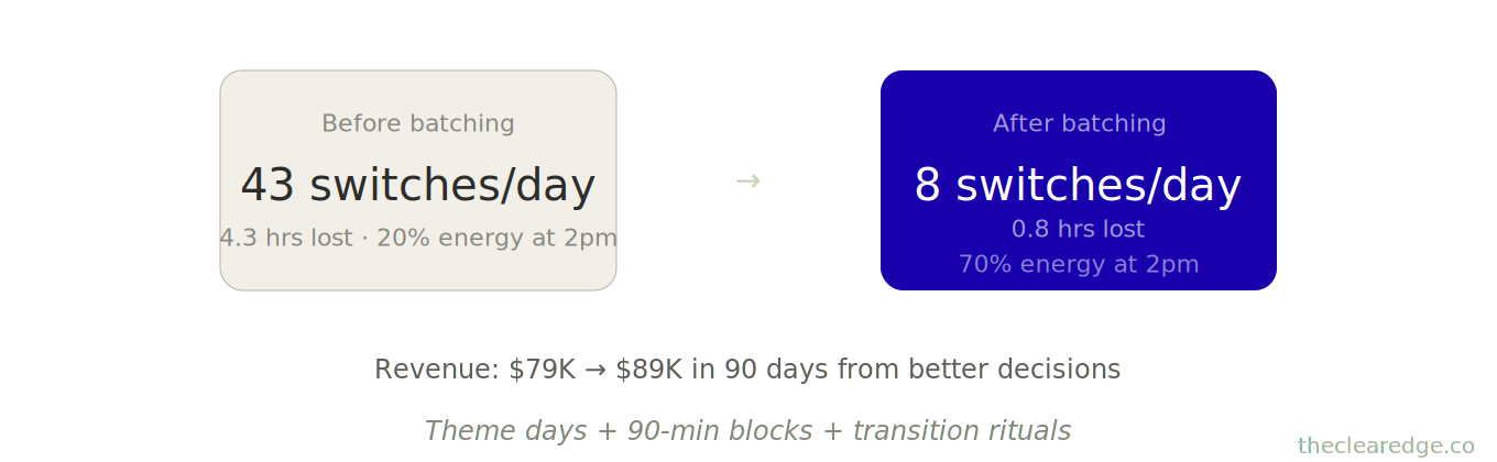 A: You move from 43 switches per day to themed days and 90-minute blocks—client work on Monday/Wednesday, team on Tuesday mornings, operations Thursday, strategy Friday morning—plus limited Slack and email windows, which turned one $79K agency owner’s 4.3 daily lost hours into 0.8 and supported a jump to $89K in 90 days.