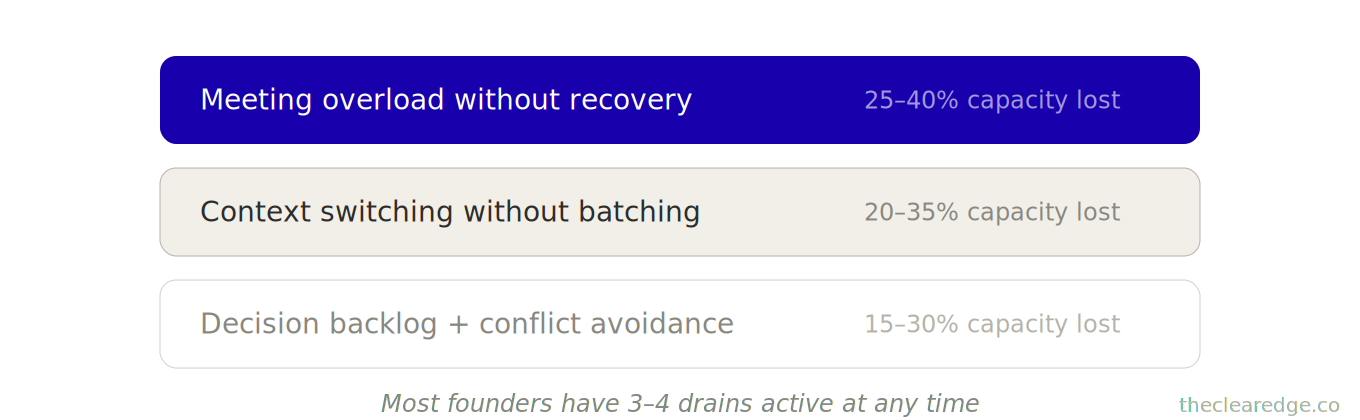 Most founders find 2–3 specific drains consuming 60%+ of their capacity, and identifying them is the first step to eliminating them.