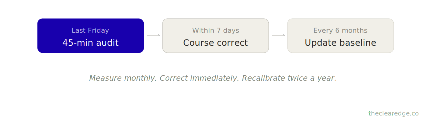 Block a last‑Friday, 45‑minute slot and run the full six‑dimension audit → Drift Score → 3+ point trigger every month, catching drift at 3–8% in about 1.4 months instead of 32% drift after 7.3 months.