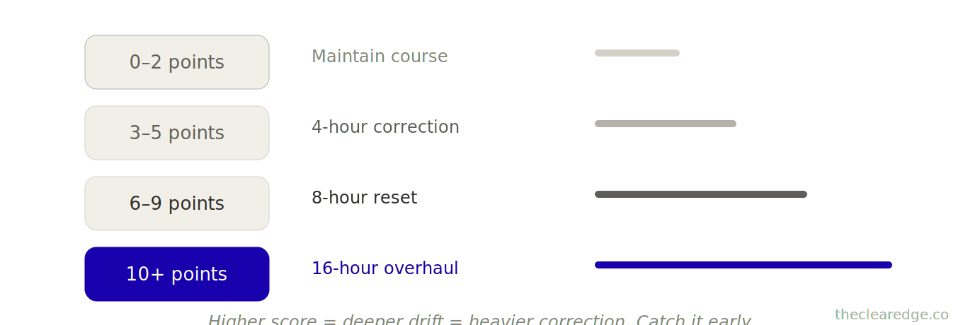 A: A total of 0–2 points means excellent alignment with no correction needed, 3–5 points calls for a 4-hour half-day session within 14 days, 6–9 points requires an 8-hour full-day reset within 7 days, and 10+ points triggers a 16-hour two-day overhaul within 48 hours plus 60 days of weekly monitoring.