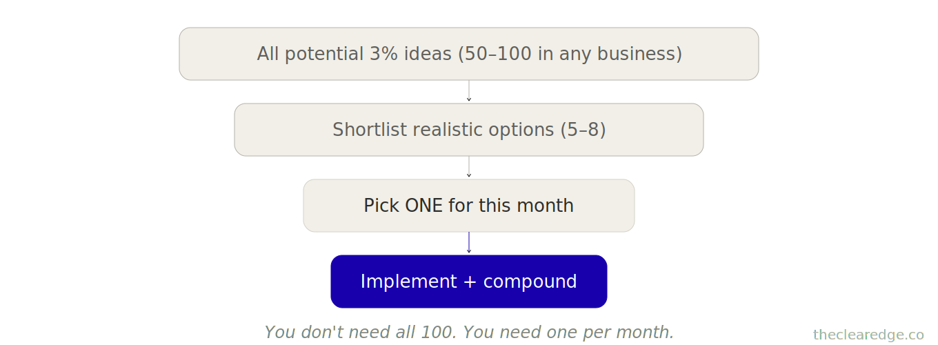 The gap wasn’t ambition. It was the absence of a structured way to capture 3% improvements every month and let them stack. Without that, you’re gambling on breakthroughs instead of banking small wins.