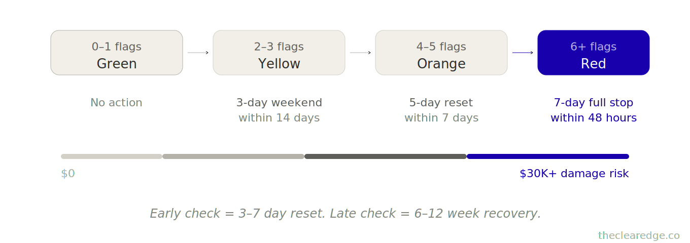 A: Green (0–1 flags) means no intervention beyond the next monthly check, Yellow (2–3 flags) triggers a 3-day weekend within 14 days, Orange (4–5 flags) requires a 5-day reset within 7 days, and Red (6+ flags) calls for a 7-day full stop within 48 hours plus 30 days of weekly monitoring.