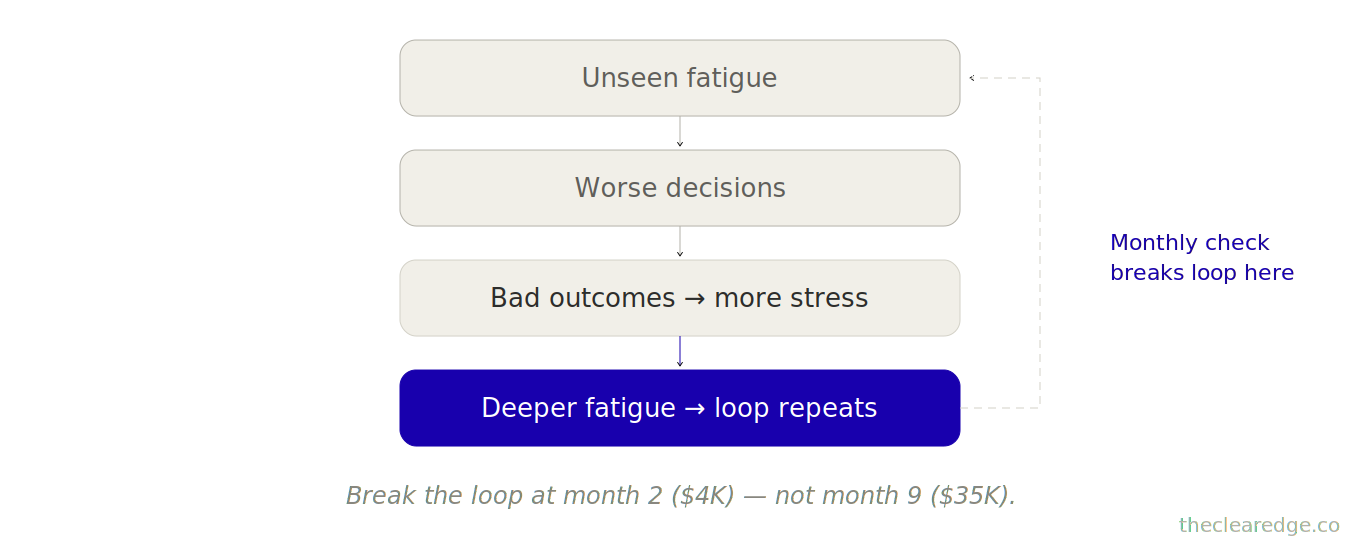 Every month you keep running at $70K–$100K on “tired but fine” judgment, you’re quietly choosing the $20K–$50K fatigue decision cost you just watched stack from $29,700 to $41,900.