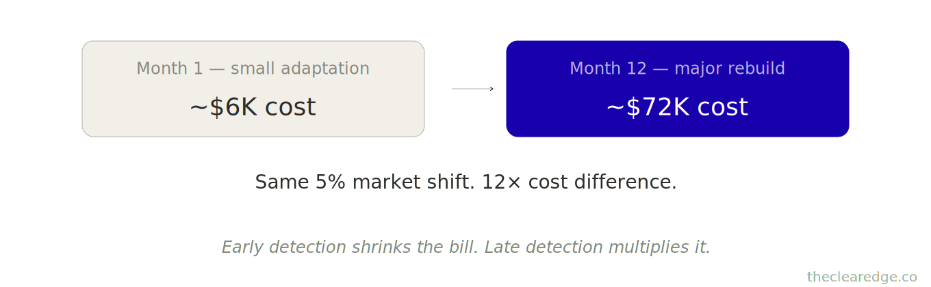 A: Because without structured monthly signal tracking, client requests, competitor moves, and channel shifts build quietly from 5–10% to 40–60% while you’re busy delivering, so by the time you notice the problem you’ve already accumulated $30K–$60K in opportunity cost and now need a full $53K–$81K pivot instead of a calm $6K–$12K adjustment.