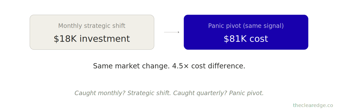 Cost of monthly adaptation vs. a panic pivot: $18K in planned investment instead of an $81K pivot bill—a 4.5x cost difference.