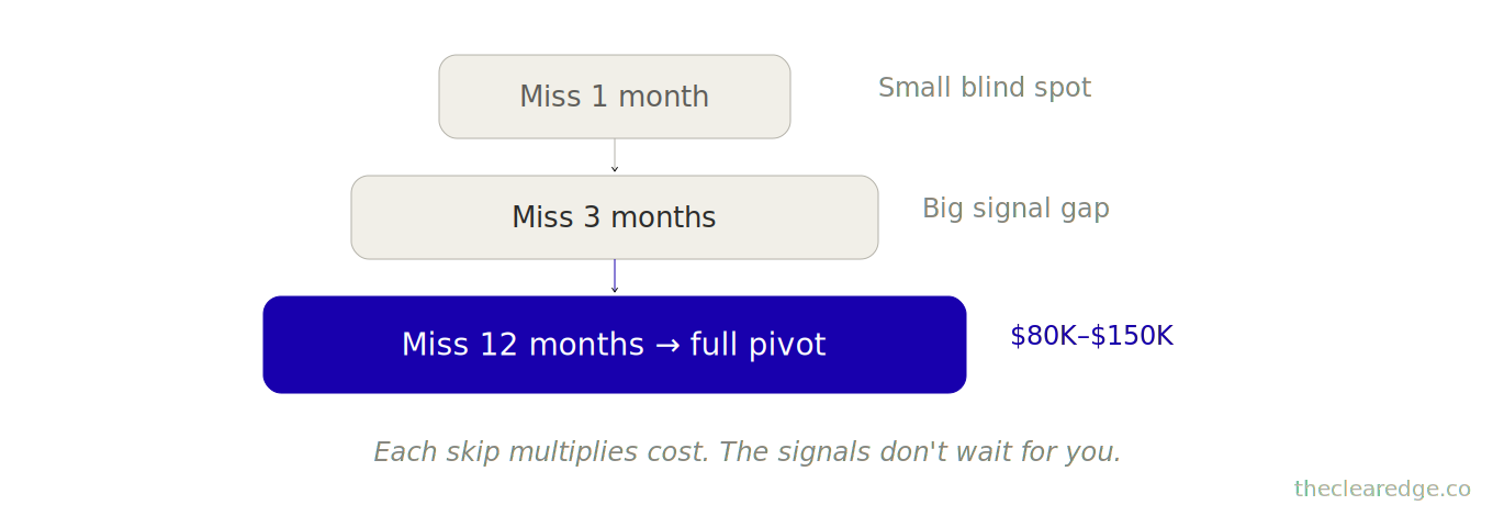 Miss twelve months: $80K–$150K in panic‑pivot costs from accumulated signals.