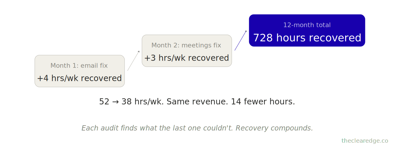 In that gap, 2 hours a week slipped into low-ROI work, quietly turning into 104 hours a year and $5K–$10K of capacity. Caught in month 1, it’s an easy correction; wait until month 12 and those 104 hours are simply gone.