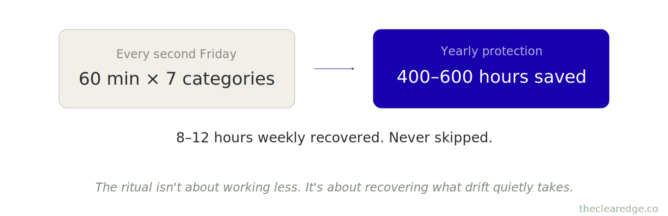 That’s how one 60-minute second‑Friday ritual becomes the best‑paid hour in your business and stops your calendar from donating $62,400–$109,200 in capacity every year to invisible time leaks.