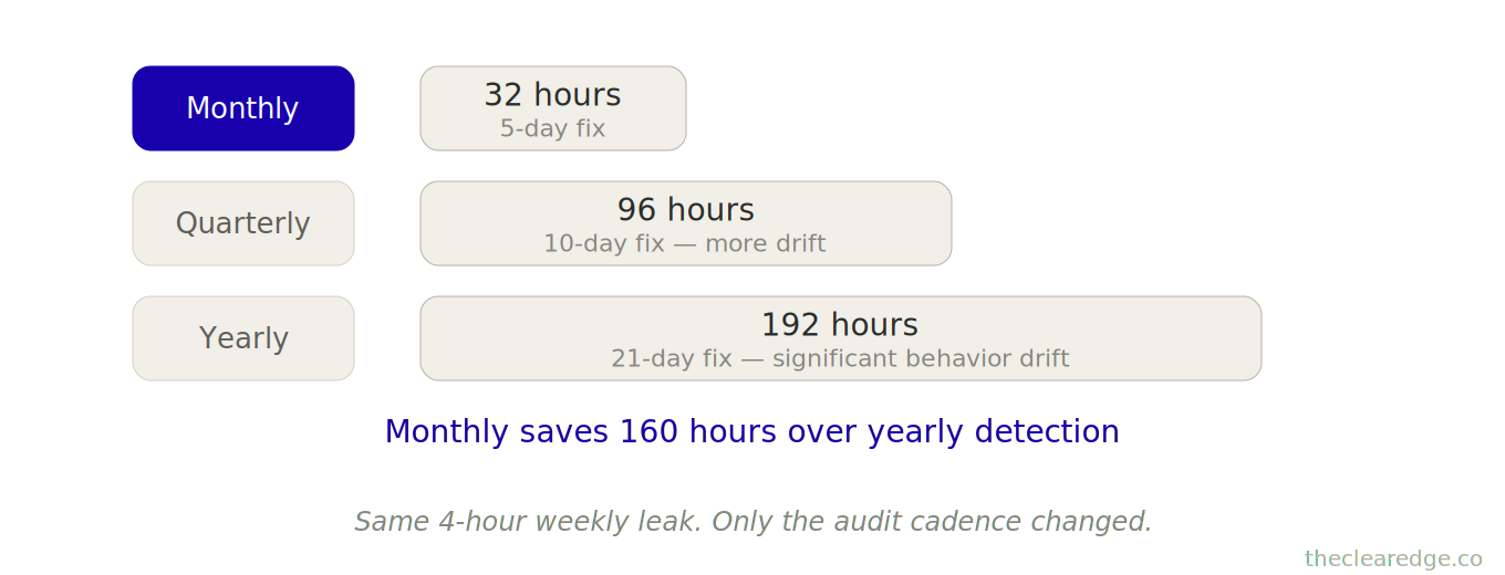 The math is brutal: monthly detection recovers 300–400 hours a year compared to waiting until you’re maxed out and only reacting once you already feel underwater.