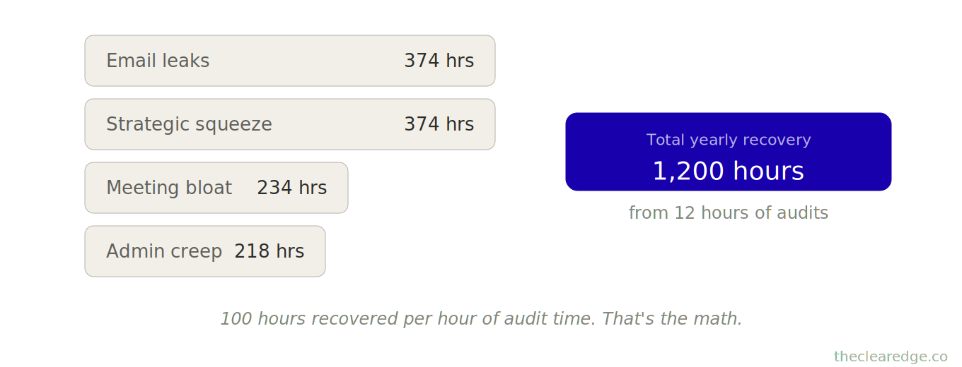 What changes if you apply it: Instead of losing 400–600+ hours and watching strategic time collapse from 20 to 6–10 hours weekly, you catch leaks within 1.6–2 months, recover 8–12 hours weekly (up to 728 hours yearly), and redirect that capacity into focused growth.