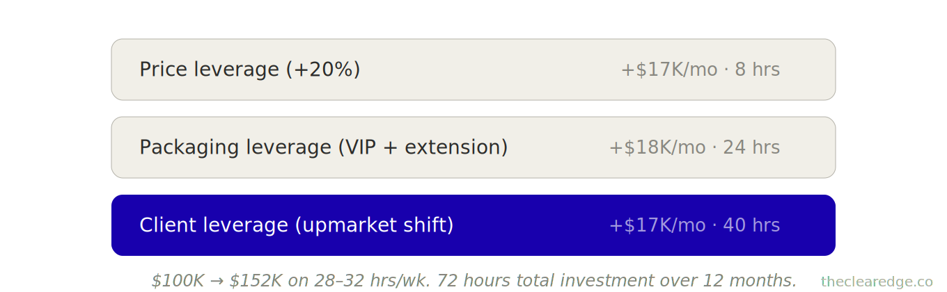 A: It stacks Price Leverage, Packaging Leverage, and Client Leverage so you move from 24 clients at $5,083 to 16 at $9,625 and reach $152K/month while founder hours shift from 30–35 to roughly 28–32 per week.