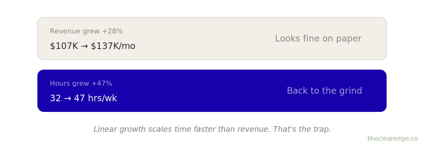 The problem: linear growth scales time. $100K → $150K via adding clients requires adding capacity, which requires adding founder coordination, which consumes the freedom systems created.