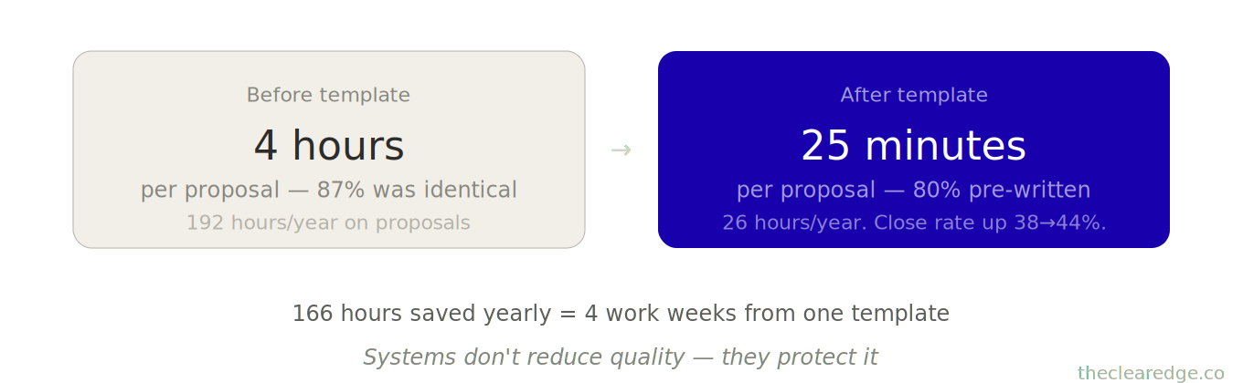 Six proposals per month → 18 hours spent recreating identical content.