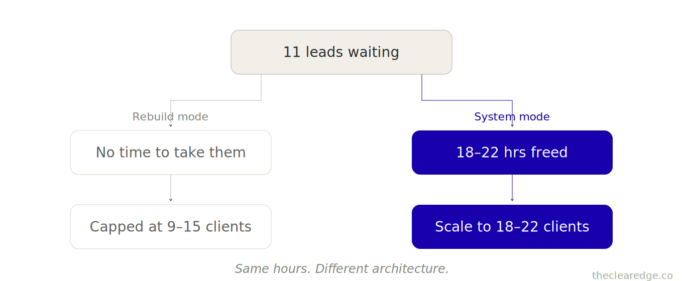 What changes if you apply it: Rebuild hours drop from 23–29 → 2–6, weekly capacity jumps by 18–29 hours, client counts climb from 9–15 → 18–22, and revenue rises from $33K–$42K → $48K–$56K+ without longer weeks.