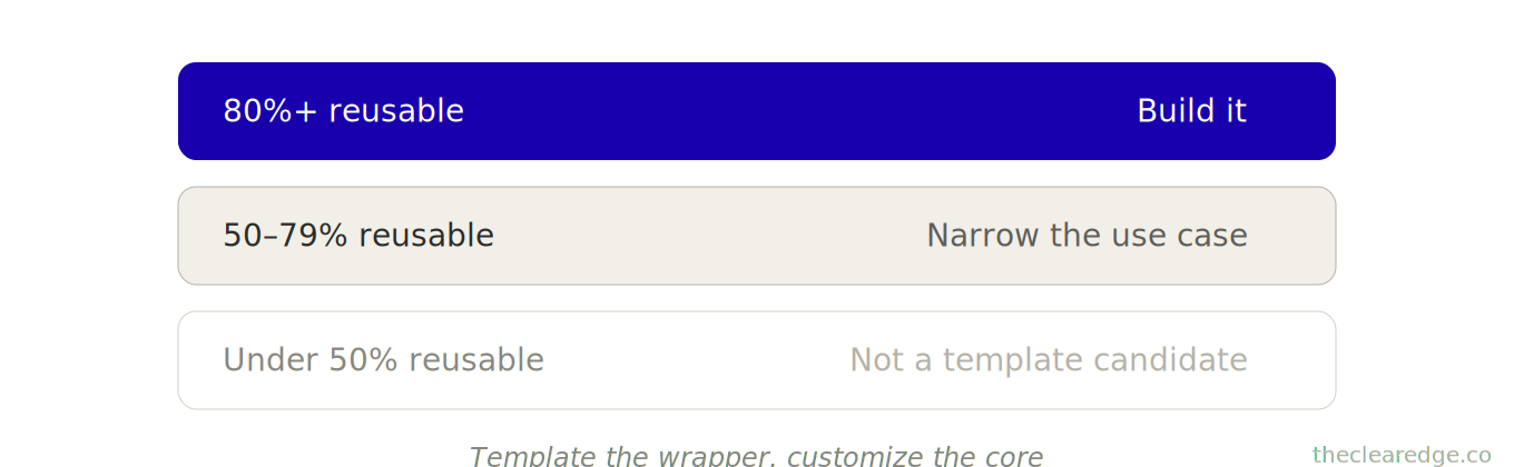 A: If 80%+ of the structure repeats across clients—like 12 of 15 projects using the same discovery, 14 of 15 sharing revision steps, or 15 of 15 following mockup → revision → final—you treat it as a One-Build candidate and only customize the last 10–20%.