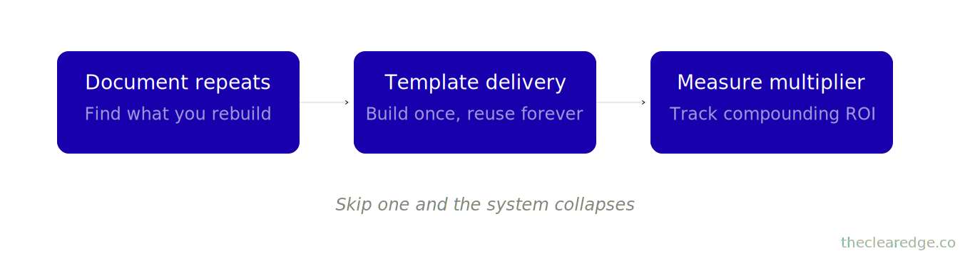 Three new clients monthly → 12 hours rebuilding identical work.