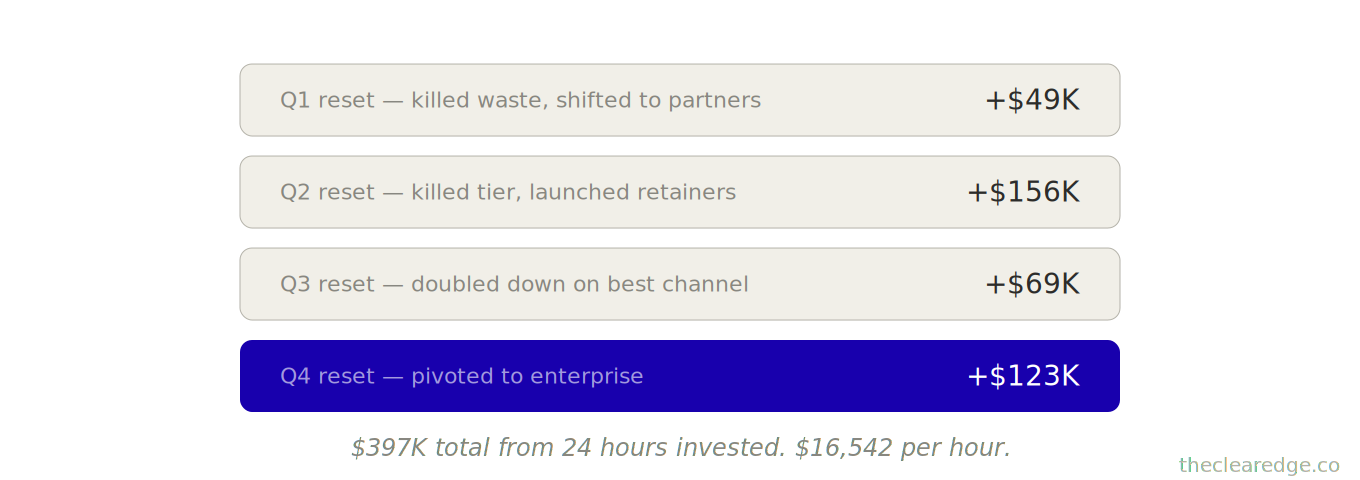 Each reset takes 4–6 hours of founder time and returns $20K–$80K in optimized quarterly execution.
