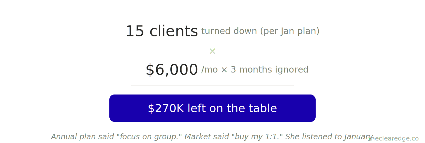 The drift problem: Annual plans without quarterly resets turn mild misalignment into major loss—like the $126K/month coach who stayed locked on a capped group offer and missed $270K in one quarter.