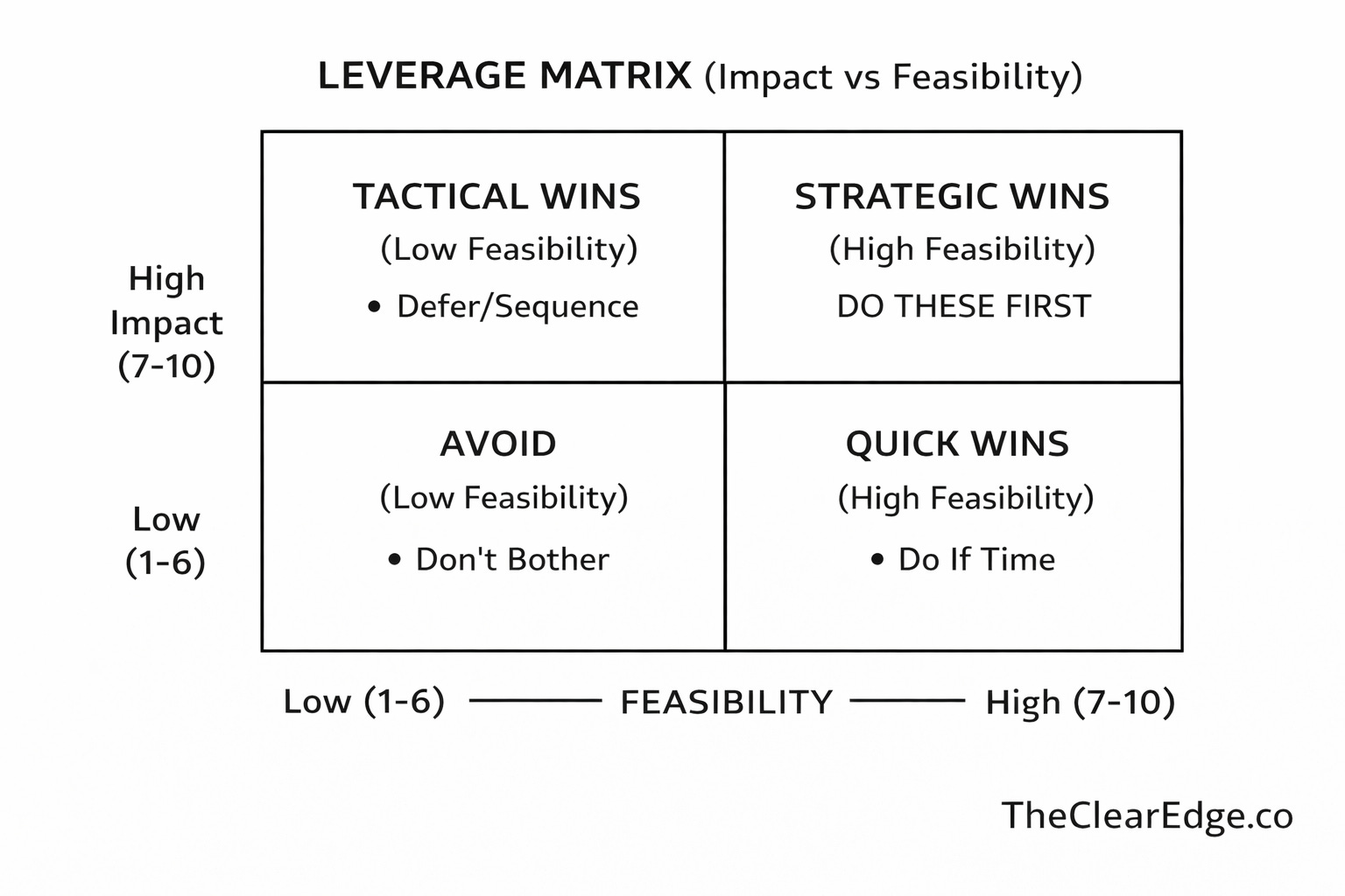 A: You list all interventions (for example hiring a COO, building a decision protocol, documenting top 10 recurring decisions), score each 1–10 on impact and 1–10 on feasibility, multiply to get a priority score, and choose the highest scorer—like documenting the top 10 decisions with a 72 score that frees 15 hours monthly—over attractive but slow or expensive options that score lower.